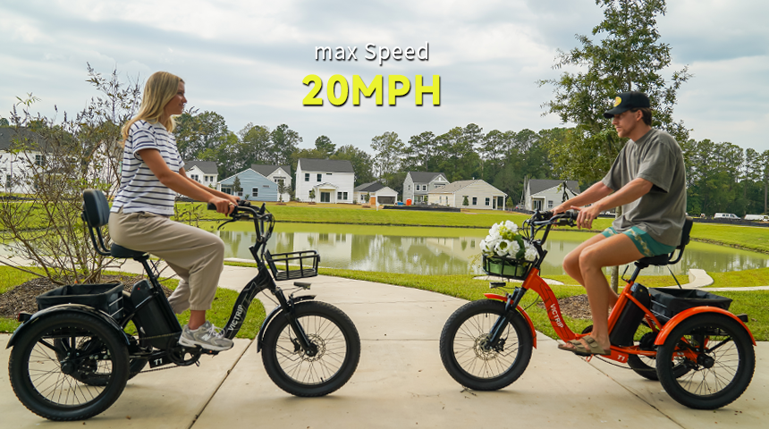 To make the joy and convenience of cycling accessible to even more people, VICTRIP proudly introduces the all-new T1 Electric Tricycle! This uniquely designed three-wheeler not only inherits the eco-friendliness and ease of electric bikes, but also sets itself apart with its exceptional stability and versatility, custom-built for riders of all ages, especially those who seek extra balance or prioritize practicality.