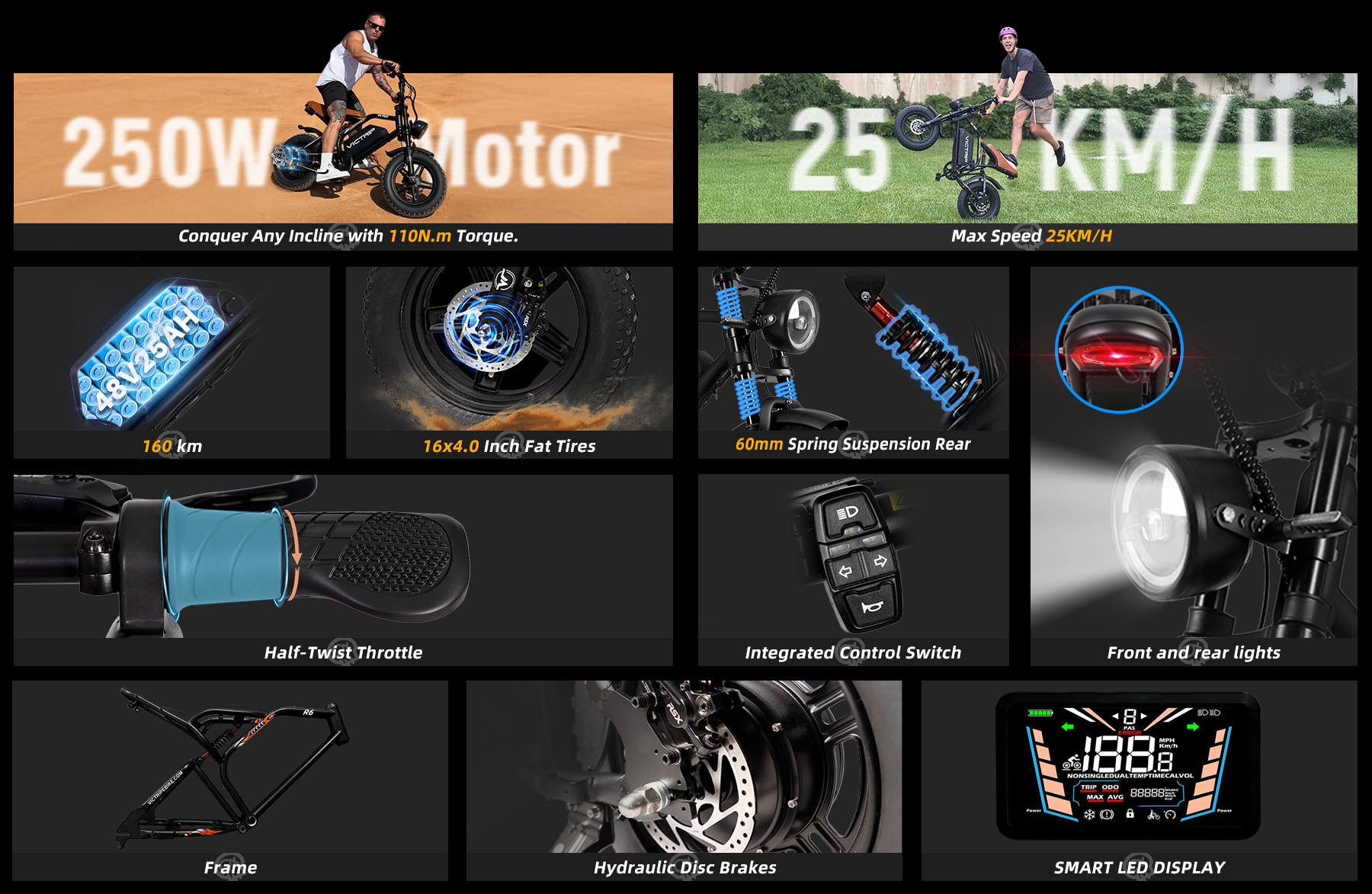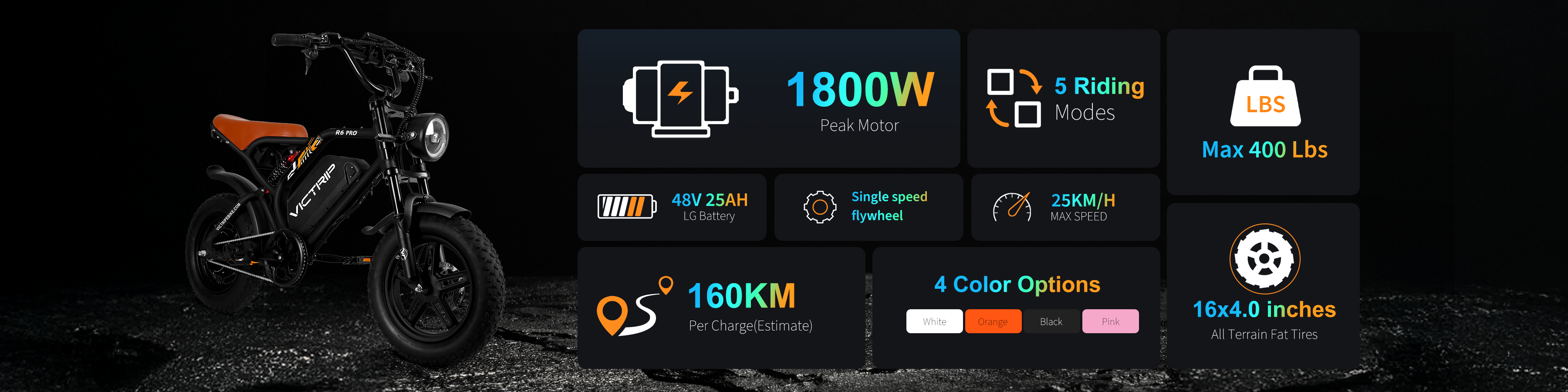 The victrip R6 Pro Moped Style Ebike is a high-performance 1800W motor designed for adults and teens who demand both speed and comfort. With a 48V25Ah LG lithium battery, durable and puncture-resistant 16x4.0 fat tires, and a top speed of 25KM/H, this is perfect for daily commuting, off-road exploration, and weekend adventures.