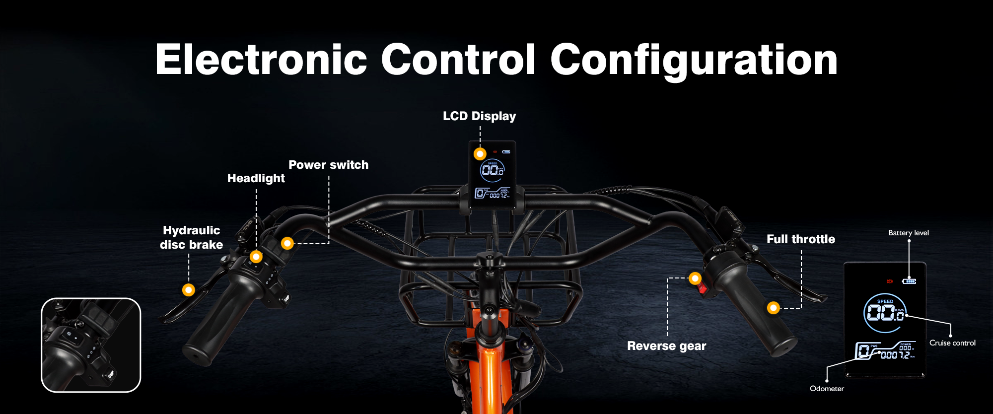 The parking brake keeps the motorized tricycle securely in place when parked, adding extra stability and peace of mind.